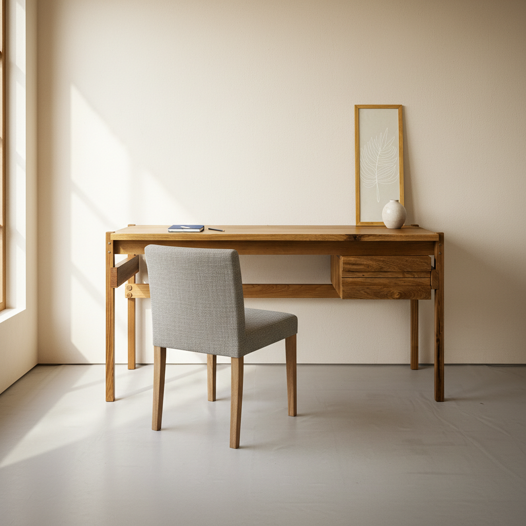 A Escrivaninha Aresta é uma releitura contemporânea inspirada na linguagem estrutural de Sérgio Rodrigues, reinterpretada em madeira maciça e construída artesanalmente.