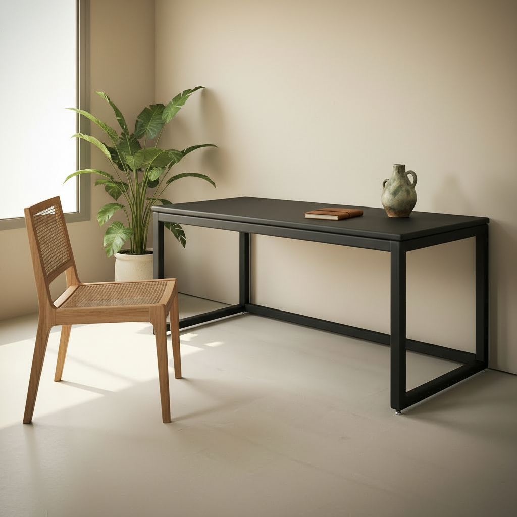 Imagine o espaço organizado por uma base sólida, a luz natural tocando a madeira, a superfície ampla pronta para ideias, decisões e projetos.
